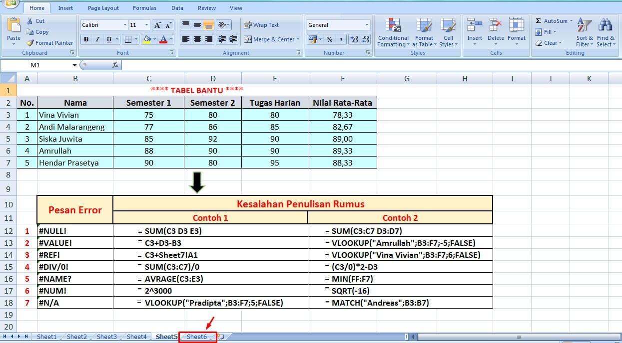 Rumus pencarian pada contoh tersebut mencari nilai rata-rata (Kolom 5) dari siswa bernama “Pradipta”. Sayangnya, siswa bernama “Pradipta” tidak ditemukan di referensi tabel bantu. Alhasil, rumus tersebut akan menampilkan pesan error yaitu #N/A.